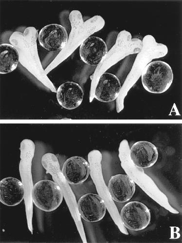Stage-35 embryos injected at the 4-cell stage in a single ventralblastomere with 250 pg of β-catenin RNA alone (A) or in combination with 250 pg of ÎN RNA (B).