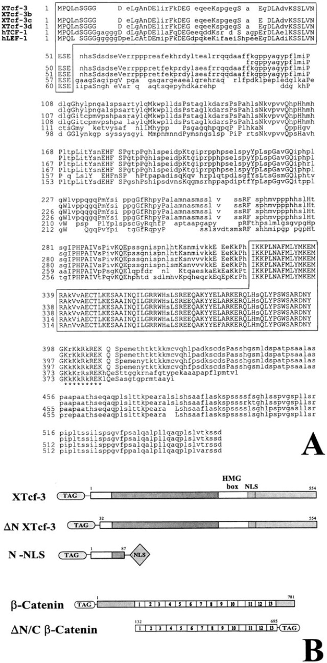 (A) Four highly homologous gene products (XTcf-3, XTcf-3b, XTcf-3c, and XTcf-3d) were identified in a stage-17 embryonic cDNA library. These are compared with human Tcf-1 and Lef-1. The HMG domains are boxed, as is the conserved N-terminal region. The sequences diverge in the region C-terminal to the HMG box. A putative nuclear localization signal (NLS) overlaps with the C-terminus of the HMG box (asterisks; Prieve et al. 1996).