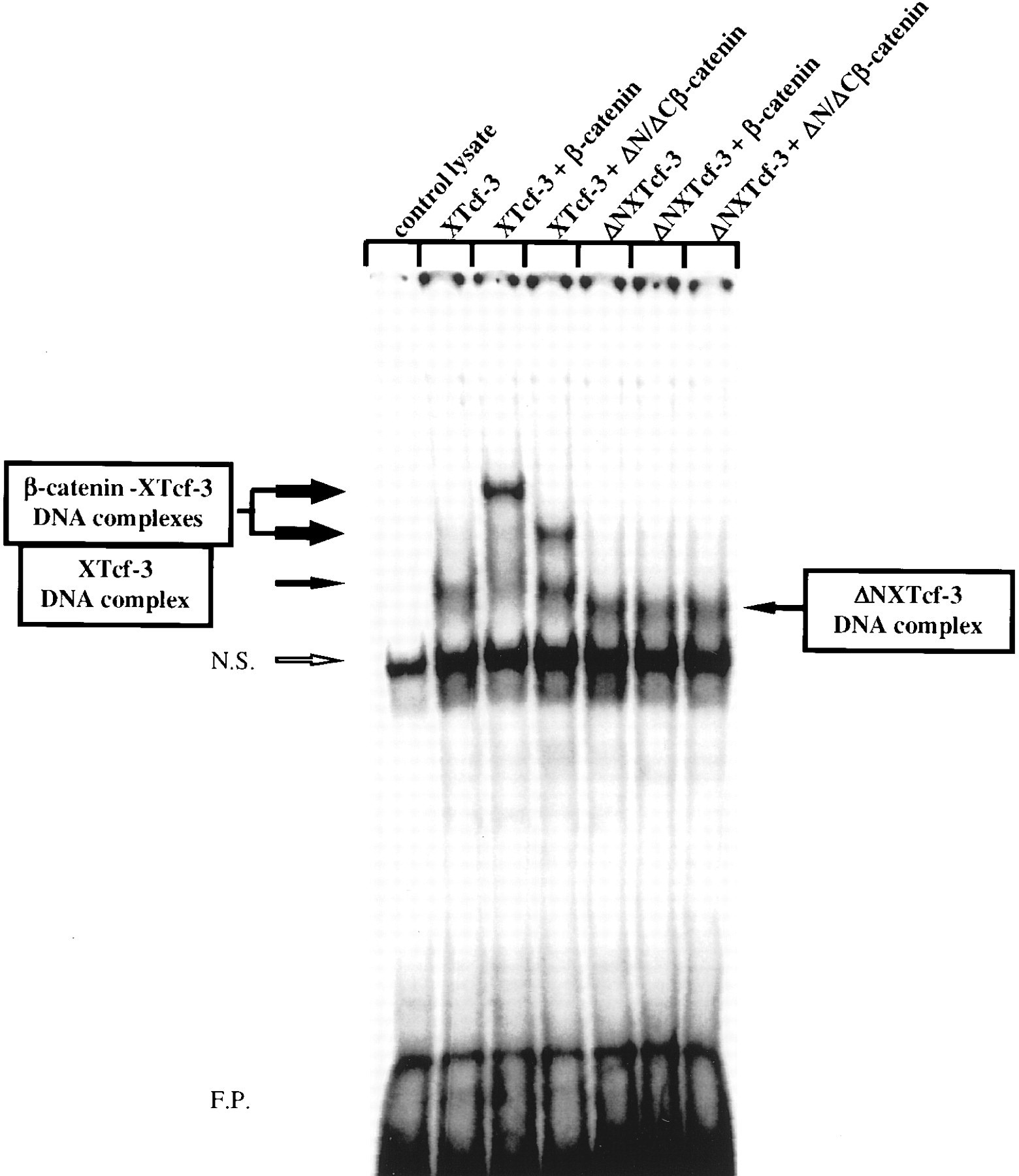 In vitro translated XTcf-3 was subjected to gel retardation with an optimal Tcf/Lef probe (see Experimental Procedures). A nonspecific band (N.S.) resulted from an endogenous protein in the transcription/translation lysate (lane 1). F.P., free probe. Cotranslated full-length β-catenin and the deletion mutant ÎN/C β-catenin yielded supershifted bands (lanes 2â4). Deletion of the first 31 amino acids of XTcf-3 (ÎN) abrogated the interaction with β-catenin (lanes 5â7).