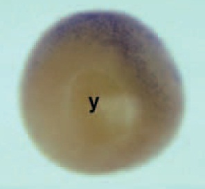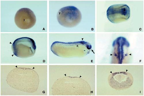 and 12.5 (B, anterior at right) Xenopus embryos express a6 mRNA in their dorsal ectoderm (y, yolk plug). (C) During neurulation (stage 15,