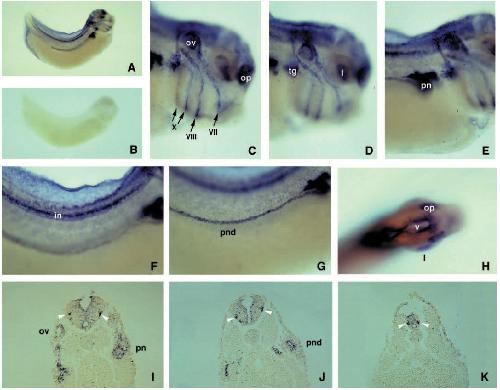 otic vesicle (ov) and within the pronephros (pn), and (J) more caudally in the pronephric duct (pnd). |