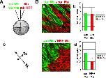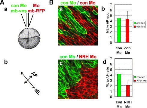 Fig. 3. NRH Mo introduced cells fail to intercalate with con Mo introduced cells and transformed into spindle-shaped cells. (Aa) We attempted to visualize the cellular intercalation event by injecting different fluorescent proteins, membrane-bound form of Venus (mb-Vns) and membrane RFP (mb-RFP), into each side of the embryo at the 4-cell-stage. (Ab) Ratio of mediolateral length (ML) to anteroposterior length (AP) was measured. (Ba) The side of embryos that received a con Mo injection showed good intercalation and highly coordinated cell movements during gastrulation. (Bc) Embryos that received NRH Mo injections (red) failed to intercalate with cells from the other side of the embryo that carried the control Mo (green). (Bb, d) As shown in mediolateral axis (longer axis) to anteroposterior axis (shorter axis) ratio, NRH Mo-bearing cells showed about half values as those of con Mo-introduced cells. NRH Mo-injected cells did not exhibit spindle-like cell shapes and still remained pebble-like cell shape compared with the con Mo-bearing cells. Scale bar, 50 μm. |