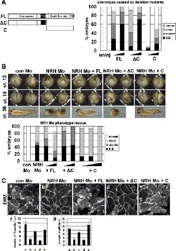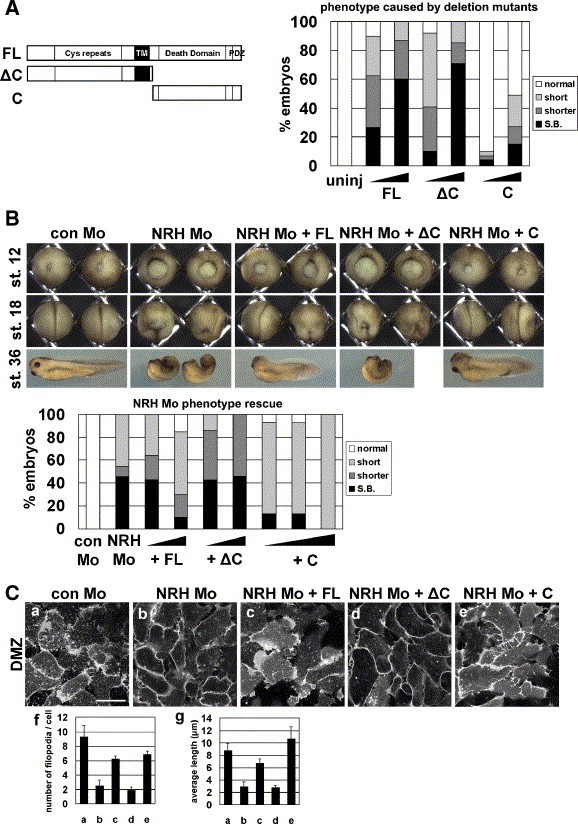 Fig. 5. The carboxyl-terminal portion of NRH is essential for NRH function and could rescue NRH Mo-induced phenotypes. (A) Two types of cleavage mutants and their effects on whole embryo: ΔC fragment (amino acids 1�240), which lacks the intracellular domain (ICD) and cytosolic fragment (C fragment) (amino acids 238�388), which includes the palmitoylation site (amino acid 244) and the entire ICD. The frequency of the phenotypes caused by the FL (250 pg and 500 pg (both, n = 90)), ΔC (250 pg (n = 90) and 500 pg (n = 89)), and C (250 pg (n = 72) and 500 pg (n = 82)) are plotted on the graph. Uninjected embryos (n = 90) developed normally. (B) Co-injections with NRH Mo: FL (250 pg (n = 56), 500 pg (n = 40)), ΔC fragment (250 pg and 500 pg (both, n = 58)), and C fragment (250 pg, 500 pg, and 1000 pg (all, n = 45)). The FL construct and C fragment partially rescued the NRH Mo-induced phenotype (n = 44). Compared with FL, the C fragment showed a higher efficacy of phenotype rescue. The ΔC fragment failed to rescue the NRH Mo phenotype, and even resulted in stronger phenotypes than those caused by the NRH Mo alone. Embryos receiving con Mo injections (n = 40) showed normal development. (C) Using the same injection series as in B, we observed changes in DMZ cell shape at the mid-gastrula stage. The NRH FL (c) and C fragment (e) constructs markedly rescued the NRH Mo-induced inhibition of filopodia formation (b) both in number and average length of filopodia as shown in f and g. However, C fragment deleted construct (d) failed to rescue NRH Mo-driven phenotypes. Scale bar, 50 μm.