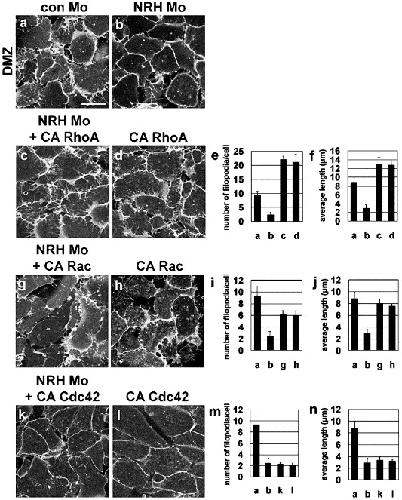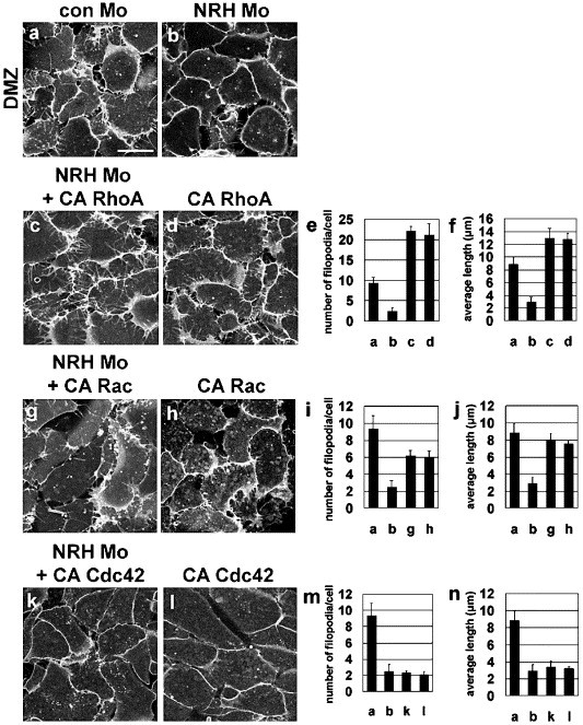 Fig. 7. NRH Mo induced-filopodia disruption was mainly rescued by active form of RhoA (CA RhoA) and partially by active form of Rac (CA Rac) but not by active form of Cdc42 (CA Cdc42). Constitutive active forms of small GTPases were introduced into two dorsal cells of 4-cell stage embryo with or without NRH Mo. Scale bars, 50 μm. NRH Mo bearing DMZ cells (b) showed poorly developed filopodia than those of con Mo bearing cells (a). However, CA RhoA (50 pg) which itself is capable of inducing filopodia (d) introduced cells rescued NRH Mo-induced phenotype (c) both in the number of filopodia (e) and the average length of filopodia (f). Coinjection with CA Rac (20 pg) showed partially rescued the number of filopodia (g, i) and the average length of filopodia (g, h). CA Cdc42 (5�20 pg) seems not to rescue filopodia formation in these experiments (k, l, m, n). |