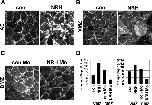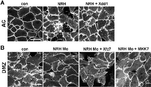 Fig. S4. NRH induced filopodia did not rescued by Xdd1, dominant negative form of Xdsh and NRH Mo-driven cell protrusion defects were not rescued by Xfz7, suggesting that NRH and Wnt/PCP pathway regulate cell protrusions independent manner. (A) Overexpression of NRH induced filopodia on animal cells but those protrusions were not repressed by inhibition of Wnt/PCP pathway component, Xdd1 (1000 pg). (B) NRH Mo (16.8 ng) and Xfz7 (50 pg) were coinjected into 2 dorsal cells at 4 cell stage embryos to investigate whether Xfz7 could rescue NRH Mo driving filopodia perturbation. Xfz7 could not reverse NRH Mo inducing phenotype even though Xfz7, whose downstream effectors like small GPTases and JNK are also known to regulate cytoskeleton, was introduced into DMZ cells with NRH Mo. We further asked whether JNK function which is required for gastrulation cell movements (Yamanaka et al., 2002) was important to cell protrusion regulation so we introduced constitutive active form of JNK, MKK7, with NRH Mo into DMZ cells. However, JNK activity was found to unable to fully rescue NRH Mo inducing filopodia perturbation, if any, it was only partial effect, suggesting that JNK activity is not directly relevant to NRH function of cell protrusion regulation. |