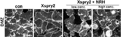 Fig. S5. Xspry2 seems to negatively function in filopodia formation. Xspry2 (500 pg) expressing dorsal cells exhibited filopodia perturbation. Co-expression with Xspry2 and lower concentration of NRH in DMZ cells showed partially rescued filopodia. Interestingly, when higher concentration of NRH was co-expressed, we could observe not only filopodia formation but also other phenotypes like cell�cell or cell�matrix interactions or adhesions. These interactions or adhesions seemed to be weakened as we observed round shaped and sometimes detached single cell during confocal microscopy. Such phenotypes were further enhanced under the presence of Xspry2, suggesting Xspry2 and NRH might be related to cell�cell interaction or cell�matrix adhesion. |