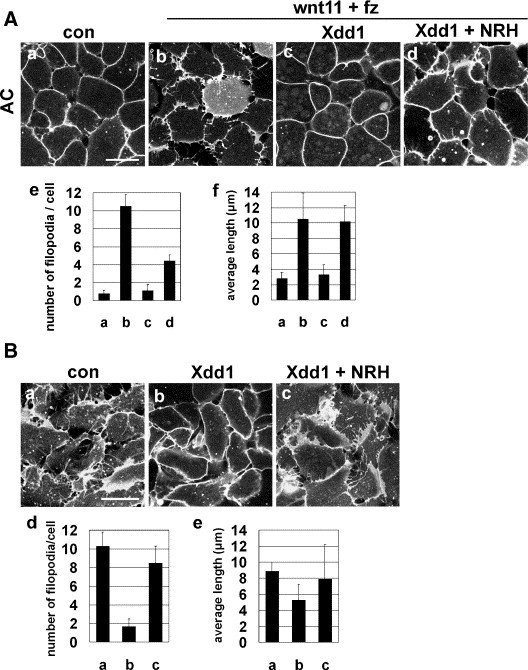 Fig. 6. NRH could rescue perturbed non-canonical Wnt/PCP pathway-driven protrusive morphology. Scale bars, 50 μm. (A) Exogenous co-injection of Xwnt11 and Xfz7 into animal cells (200 pg each, b) was capable of producing well-developed filopodia in animal cells and these protrusions were almost completely suppressed by Xdd1 (1000 pg, c), PDZ domain deleted form of Disheveled. NRH mRNA (400 pg) could partially recover filopodia formation in number (e) but almost fully in average length of filopodia (f). (B) All mRNAs were injected into two dorsal cells at 4-cell stage embryos. Filopodia of DMZ (a) were suppressed by Xdd1 introduction (b) both in number (d) and average length (e) and those effects by Xdd1 were restored by NRH co-injection (c) though they were partially rescued (d, e). |