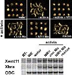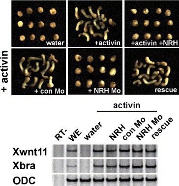 Fig. S1. NRH inhibits activin-induced elongation. Since animal cap cells expressing exogenous activin can mimic mesodermal cells, we used this animal cap assay with NRH and the NRH Mo. Interestingly, both NRH and NRH Mo inhibited activin-induced elongation and the NRH Mo-driven inhibition was completely rescued by co-injecting NRH mRNA. Since no combination of injections caused transcriptional changes in the molecular markers Xbra and Xwnt11, we thought NRH might regulate gastrulation cell movements rather than mesodermal induction and patterning. |
