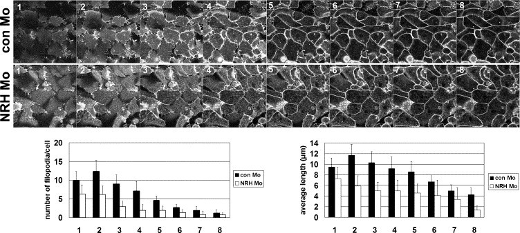 Fig. S3. Stacks of images that were sliced along Z axis showed NRH Mo caused filopodia perturbation in involuting dorsal cells. To observe overall cell shape changes induced by NRH Mo, we adopted Z stack application of LSM 510 software. We set the lowest focus and the highest focus then we configured the depth of each plane. Once we set the numbers of planes that we need, the dept would be determined automatically. Generally, it was set to have 0.9�1.2 μm depth. In this figure, con Mo introduced cells and NRH Mo introduced cells were sliced with the depth of 1.05 μm and 1.06 μm from the lowest plane (the leftmost panel, 0 μm) to the highest plane, respectively. While NRH Mo introduced involuting dorsal cells showed poorly developed filopodia, con Mo introduced cells showed well-developed filopodia Both average number and length of filopodia on con Mo and NRH Mo introduced cells displayed anti-sigmoid curves. |