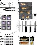 Fig. 1. Gain of NRH function induces severe gastrulation defects but does not affect transcription regulation. (A) Embryos received an NRH mRNA injection (200 pg (n = 67), 500 pg (n = 75), and 1000 pg (n = 73)) in two dorsal cells at the 4-cell stage were classified into short or shorter anteroposterior (A�P) axis and spina bifida (S.B.). Embryos whose A�P axis was shortened compared with uninjected embryos (n = 70) were further classified into two categories according to the severity of the phenotype: that is, embryos were categorized as having a short A�P axis (short) or a very short A�P axis (shorter). (B) Whole-mount in situ hybridization (WISH) analysis was performed with a lineage tracer that was introduced into two dorsal cells at the 4-cell stage. Mesodermal markers Xbra and Xwnt11 and the presumptive head marker Xgsc were used in the WISH analysis. (C) Semi-quantitative RT-PCR analyses were carried out to obtain molecular clues regarding the role of NRH in mesodermal induction and the FGF signaling pathway. Primer pairs for known non-canonical FGF target genes, Xspry2 and Xmc, as well as canonical FGF target genes, Xbra and Xwnt11, were used in this assay. (D) In later stages, embryos that received the NRH mRNA injection were stained with 12/101 antibody (somites) or MZ15 antibody (notochord). There was no change in the differentiation of the somites and the notochord. (E) The subcellular localization of NRH was examined using the C-terminal Vns-tethered construct (100 pg) in dissected animal cap (AC) and involuting dorsal marginal zone (DMZ) explants. The subcellular localization was visualized by confocal microscopy. Scale bar, 100 μm |