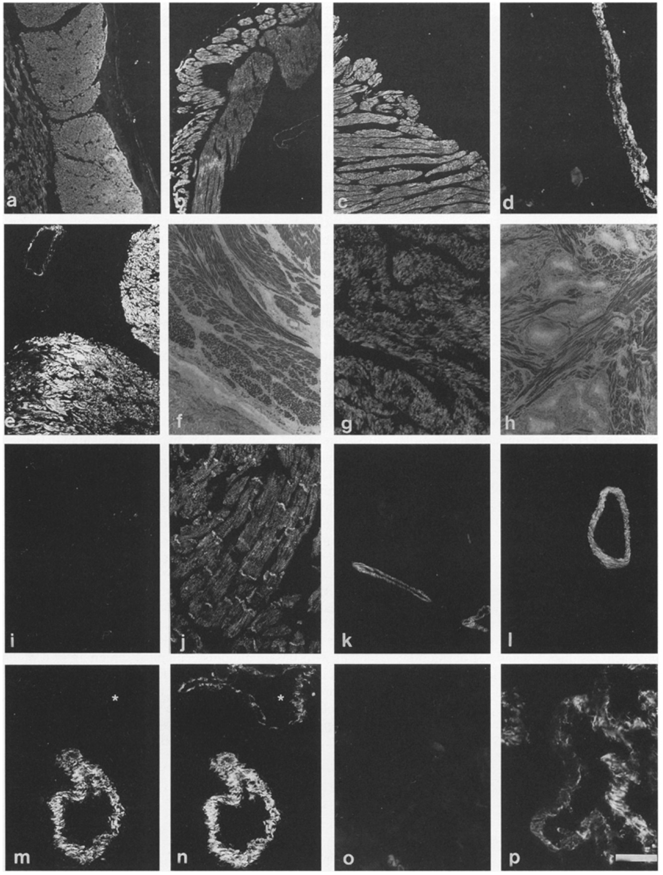 o) and either pDes (j) or sm-1 (n and p) show the absence of smoothelin in heartmuscle, skeletal muscle, and myoepithelial cells as well