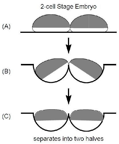 Fig. 6. Lithium treatment and bisection at the first cleavage. (A) Two