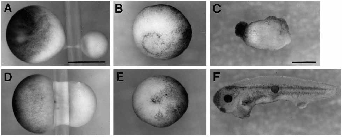 0.83). (A,D) Just after placing a glass rod. (B,E) Vegetal view at gastrulation. (C,F) At the tadpole stage. Bar in A for A, B, D and E and bar in