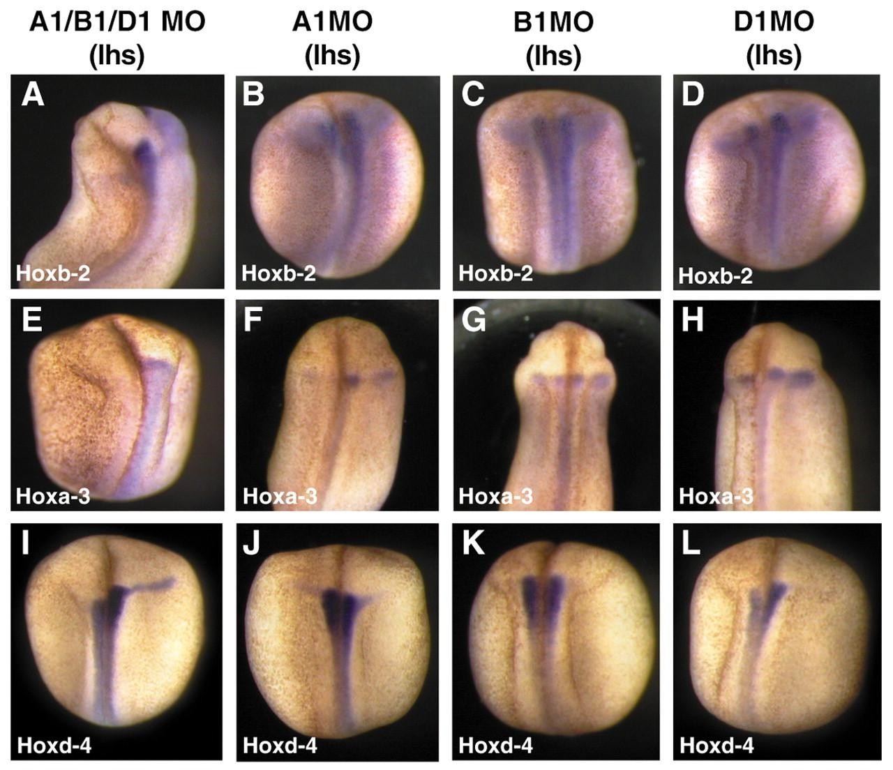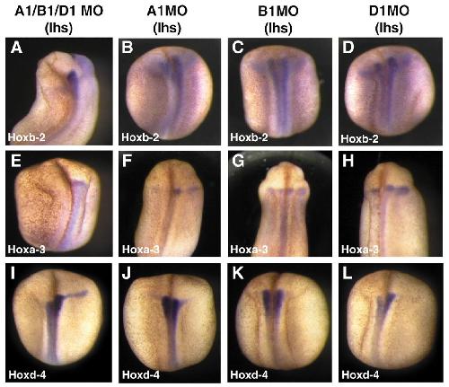 Fig. 8. Effects of single PG1 knockdowns on Hox genes. Embryos injected on the left-hand side (lhs) with the triple PG1 MO combination had reduced Hoxb2 (A: 93%, n=28), Hoxa3 (E: 100%, n=14) and Hoxd4 (I: 79%, n=14). The Hoxa1 MO weakly downregulated Hoxb2 (B: 80%, n=10) and reduced Hoxa3 (F: 54%, n=11), but not Hoxd4 (J: 100%, n=20). The Hoxb1 MO had no effect on any of these genes (C: Hoxb2, 100%, n=10; G: Hoxa3, 100% n=9; K: Hoxd4, 100%, n=18). Hoxd1 MO reduced Hoxd4 expression (L: 100%, n=16), weakly reduced Hoxb2 (D: 43%, n=14), but did not affect Hoxa3 (H: 100%, n=10). |