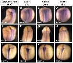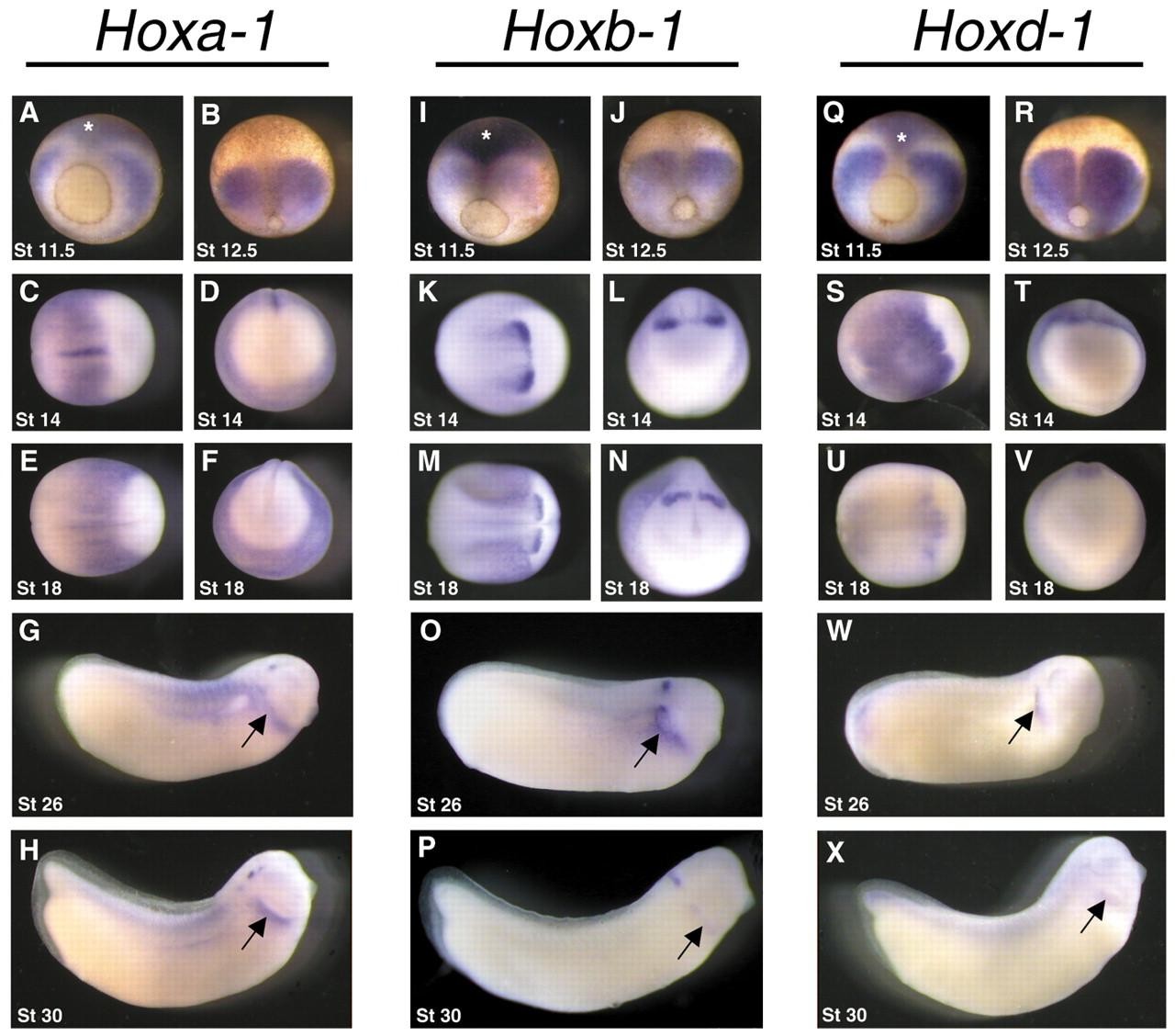 Fig. 1. Hox PG1 genes have overlapping expression domains during Xenopus laevis development. Hoxa1 (A-H), Hoxb1 (I-P) and Hoxd1 (Q-X) have overlapping expression patterns. Gastrula stage embryos (A,B,I,J,Q,R) are shown from the vegetal side, dorsal up. When compared with Otx-2 expression (* in A,I,Q), it can be seen that the Hox expression does not reach the presumptive midbrain region. Neurula embryos are shown from the dorsal side, anterior to the right (C,E,K,M,S,U) or from the anterior side, dorsal up (D,F,L,N,T,V). Later embryos are shown from the lateral side, anterior to the right (G,H,O,P,W,X). Note pharyngeal arch expression of all three PG1 genes (arrows in G,H,O,P,W,X). |