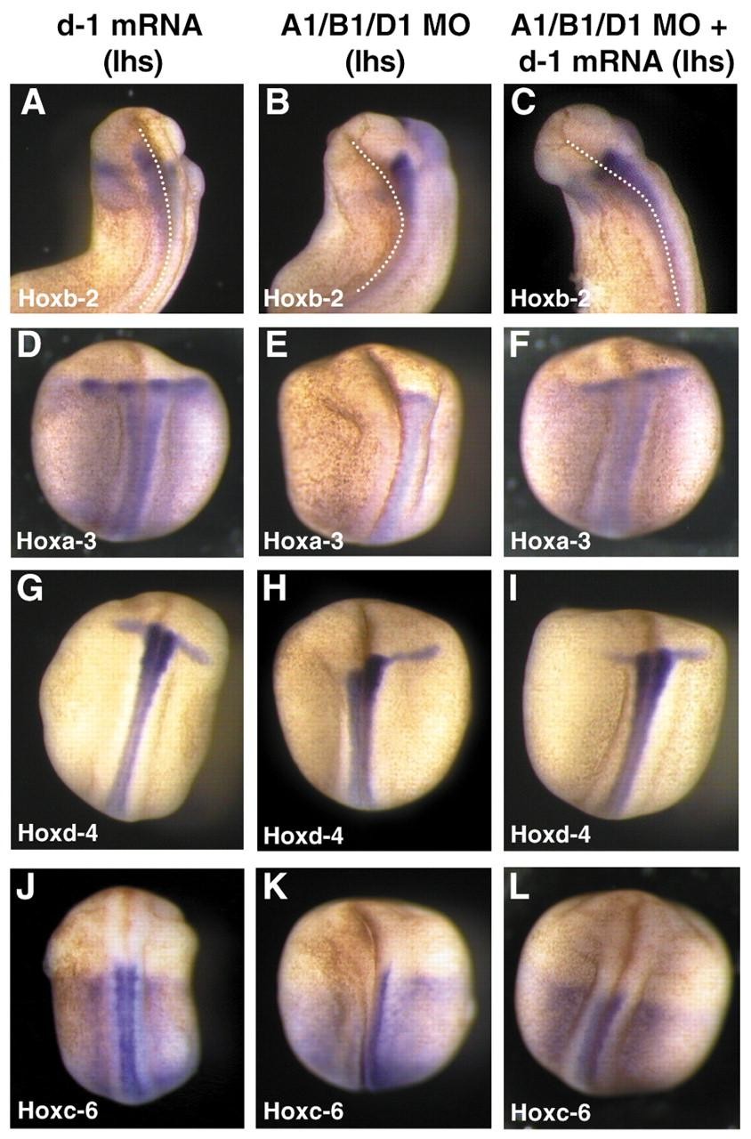 Fig. 7. Hoxd1 mRNA rescues Hox expression in PG1 knockdown embryos. Embryos injected on the left-hand side (lhs) with Hoxd1 MO insensitive mRNA (A,D,G,J), all three PG1 morpholinos (B,E,H,K) or a combination of both (C,F,I,L) were analysed for expression of Hoxb2, Hoxa3, Hoxd4 and Hoxc6. Embryos are shown from the dorsal side, anterior to the top. Hoxb2 expression was expanded posteriorly with Hoxd1 mRNA (A: 75%, n=12), lost with the triple PG1 morpholinos (B: 93%, n=28) and rescued when a combination was injected (C: 48% of embryos had downregulated expression, n=33). The other Hox genes were not affected by the Hoxd1 mRNA overexpression. PG1 MO downregulated expression of Hoxa3 (E: 78%, n=9), Hoxd4 (H: 100%, n=9) and Hoxc6 (K: 78%, n=9) and in the rescues this downregulation was reduced to 34%, 20% and 33% for Hoxa3, Hoxd4 and Hoxc6, respectively (F,I,L). |