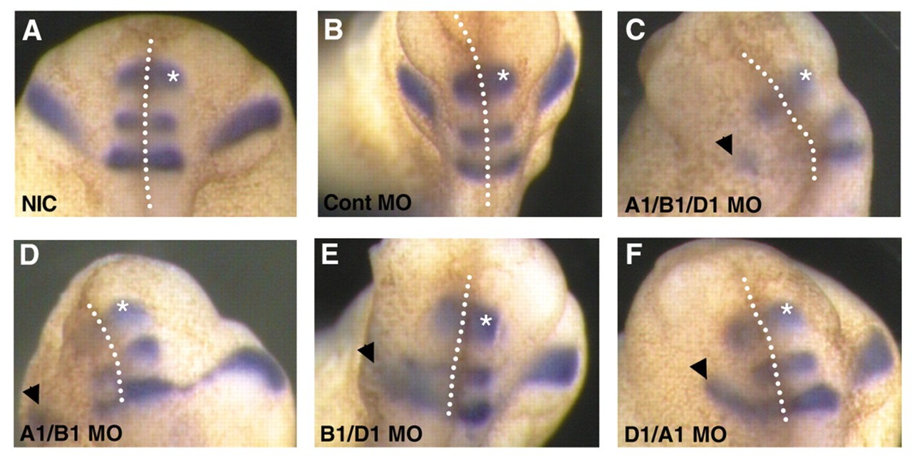 Fig. 3. The triple PG1 knockdown phenotype is more severe than the double knockdowns. Morpholinos for each Hox PG1 gene were injected either in double (D: A1/B1 52%, n=25; E: B1/D1 48%, n=29; F: D1/A1 64%, n=33) or triple (C: A1/B1/D1 94%, n=35) combinations into the left-hand side of the embryo and Krox20 and Engrailed-2 (*) expression analysed. The hindbrain region of early tailbud stage embryos is shown, with anterior to the top. Non-injected controls (NIC; A), and embryos injected on the left-hand side of the embryo with control morpholino (B) are also shown. Arrowheads indicate neural crest expression. |