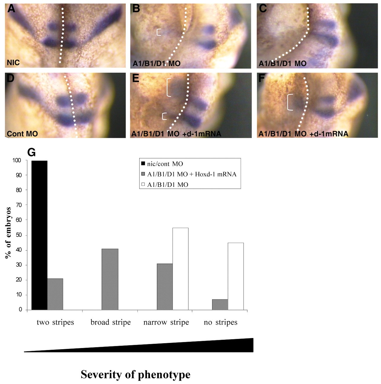 Fig. 4. Hoxd1 mRNA can partially rescue the triple PG1 morpholino phenotype. Early tailbud stage embryos were injected on the left-hand side (lhs) with all three PG1 morpholinos (A1/B1/D1 MO) either alone (B,C), or in combination with Hoxd1 mRNA (E,F). Non-injected controls (NIC) and control morpholino (Cont MO) are also shown (A,D). Anterior is to the top. G: Krox-20 expression is partially rescued by Hoxd1 RNA. Numbers of embryos with two stripes (E), one broad stripe (F), one narrow stripe (B) or no stripes (C) of Krox20 expression were scored. Co-injection of Hoxd1 RNA partially rescued the Krox20 expression (n=29), which was either absent or very much reduced in embryos injected only with A1/B1/D1MO (n=18). |