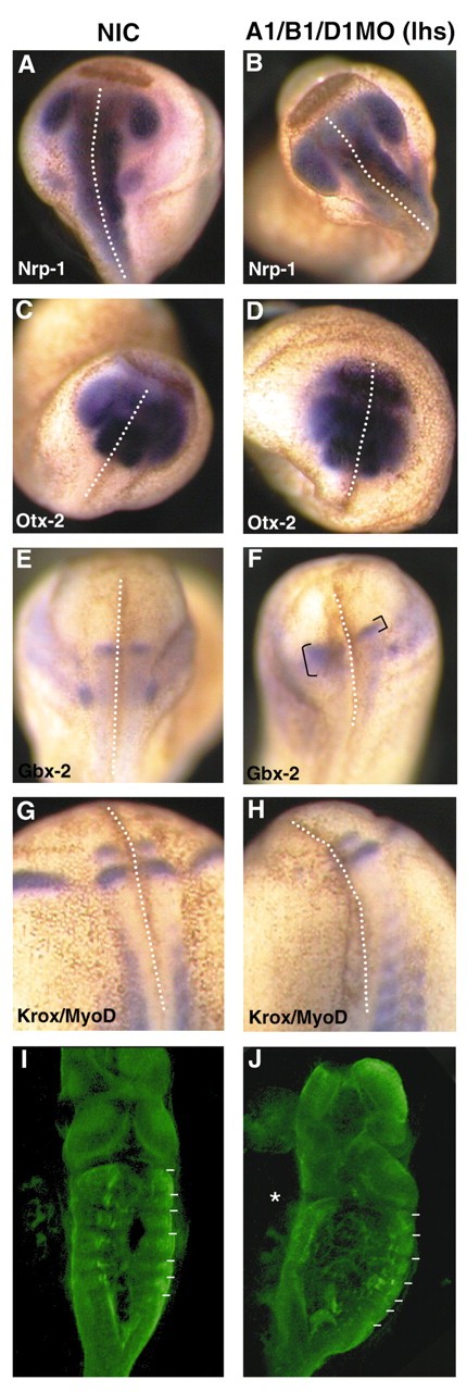 Fig. 5. Triple PG1 knockdown severely affects hindbrain patterning. Morpholinos for each of the Hox PG1 genes (A1/B1/D1MO) were co-injected into the lhs of the embryo (B,D,F,H,J). Non-injected controls are also shown (A,C,E,G,I). The hindbrain region is shown, with anterior to the top. Expression of the neural marker Nrp1 (A,B: 100%, n=11), the anterior marker Otx2 (C,D: 100%, n=10), Gbx2, which is expressed in r1 (E,F: 77%, n=13) and Krox20 (G,H: no stripes 41%; one faint stripe 35%, n=71), was analysed. Dotted line indicates the midline. In later embryos (st. 46), the neural antibody 2-G9 was used to show the morphology of the hindbrain [NIC, I; A1/B1/D1MO, injected on the left-hand side (lhs) *, J: 100%, n=5]. Rhombomere boundaries are marked. |