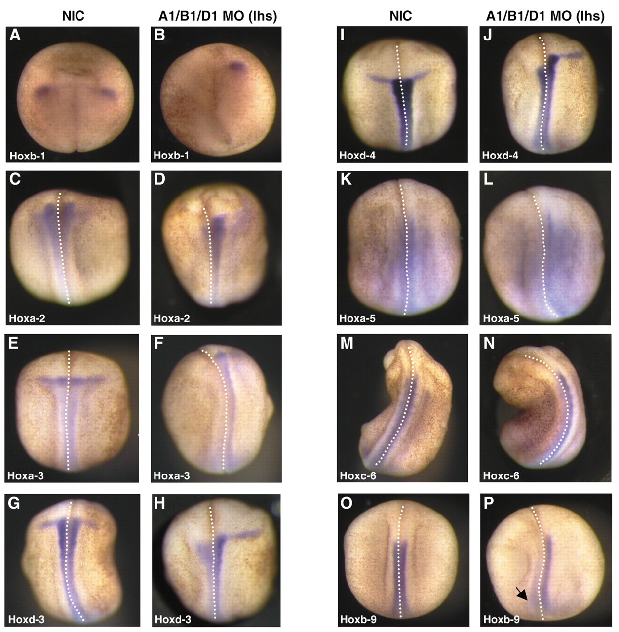 Fig. 6. Knockdown of all three PG1 genes affects more posterior Hox genes. Non injected controls (NIC; A,C,E,G,I,K,M,O) and embryos injected on the left-hand side (lhs) with all three Hox PG1 morpholinos (A1/B1/D1MO; B,D,F,H,J,L,N,P) were analysed for Hox gene expression at early tailbud stage. Embryos are shown from the dorsal side, anterior to the top. Hoxb1 expression was lost (A,B: 70%, n=10), and Hoxa2 (C,D: 100%, n=18) and Hoxa3 (E,F: 100%, n=14) expression was almost completely absent. Hoxd3 (G,H: 68%, n=19) and Hoxd4 (I,J: 79%, n=14) neural tube expression was still present, but the pharyngeal arch expression was lost. The more posterior Hox genes (Hoxa5, K,L: 100%, n=10; Hoxc6, M,N: 71%, n=14; Hoxb9, O,P: 93%, n=14) had reduced neural tube expression in the anterior part of the embryo but their posterior expression domains (arrow) and mesodermal expression were unaffected. |