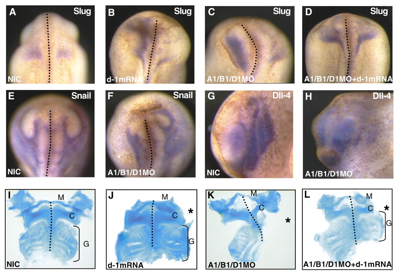 Fig. 9. Knockdown of all three PG1 genes affects the development of neural crest and its derivatives. Non-injected controls (NIC; A,E,G,I) and embryos injected on the left-hand side with Hoxd1 MO insensitive mRNA (B,J), all three Hox PG1 morpholinos (A1/B1/D1MO; C,F,H,K) or a combination of both (D,L) were analyzed for neural crest gene expression, or stained with alcian blue to show the craniofacial structures. The embryos shown in A-F are early tailbud stage embryos shown from the dorsal side with anterior to the top. With the PG1 MOs, neural crest cells fail to migrate away from the hindbrain, as shown by Xslug (C: 86%, n=29) and Xsnail (F: 100%, n=14) expression. This is rescued (22% of embryos with restricted Xslug expression, n=9) by Hoxd1 overexpression (D) and simple overexpression leads to an expanded Xslug domain (B: 100%, n=10). Slightly later tailbud embryos analyzed for dll4 are shown from the left-hand side, with anterior to the left, and in the triple PG1 knockdown dll4 expression in the branchial arches is restricted to close to the hindbrain (50%) or completely lost (G,H: 44%, n=16). Alcian blue was used to stain the cartilage of stage 49, embryos (I-L) shown from the ventral side to show the craniofacial structures (injected side on the right:*). The complete gill area is missing in the triple morpholino injected embryos (K: 82%, n=11) and this is rescued (26% of embryos with missing gill, n=19) when Hoxd1 mRNA is co-injected (L). C, ceratohyal; G, gill cartilage; M, Meckel's cartilage. Dotted line indicates midline. |