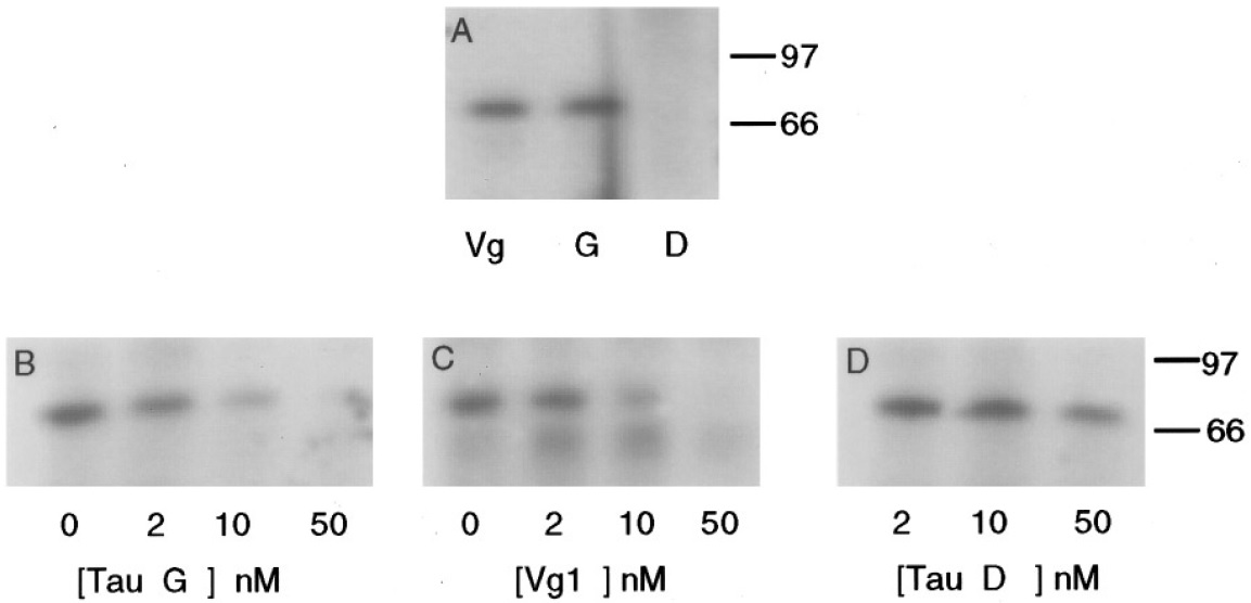 RNA competitor tau RNA-G (B), Vg1 RNA-LS (C), or tau RNA-D (D), and 7.5 mg of S100 oocyte cytoplasmic extracts was followed by an