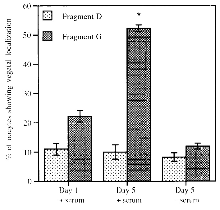 FIG. 3. Quantitative analysis of results obtained from whole of mount in situ hybridization of microinjected oocytes. Statistical analysis of the vegetal localization of tau RNA-G or tau RNA-D in injected oocytes grown for 1 or 5 days in the presence of serum or for 5 days in serum-free medium. Data are based on three independent experiments in each of which about 300 oocytes were examined for each treatment and are expressed as the mean percentages of oocytes showing vegetal localization. The asterisk indi-cates significant differences (P 0.0001) in the number of injected oocytes showing vegetal localization of the tau RNA-G, following growth for 5 days in a medium containing serum relative to all the other treatments. The data were analyzed by a two-level nested ANOVA, with unequal sample sizes and post hoc comparisons.