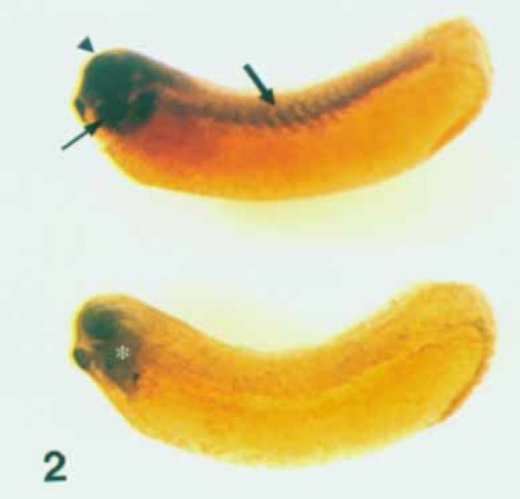 (top) identifies transcripts in the neural tube (arrowhead), pharyngeal
