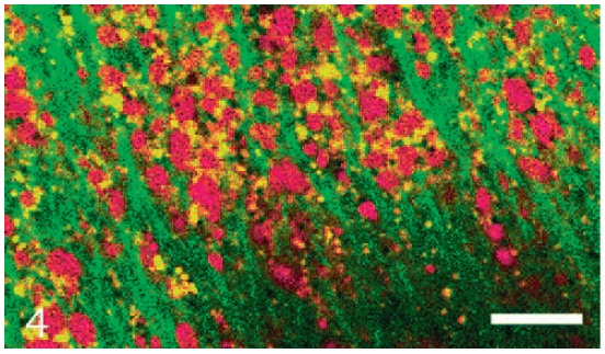 fluorescein-labeled tubulin. The channels between the Nile Redstained
