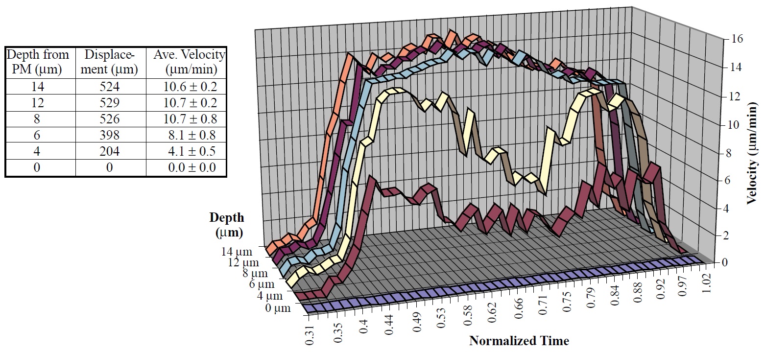 Fig. 6. Velocity of yolk platelets at five different depths inside the plasma membrane (PM) at the vegetal pole of a fertilized, immobilized egg