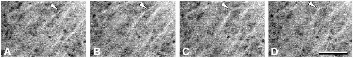in the parallel array of a fertilized, immobilized egg injected with rhodamine-labeled tubulin. The arrowhead in each frame points to a segment