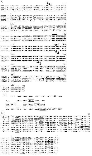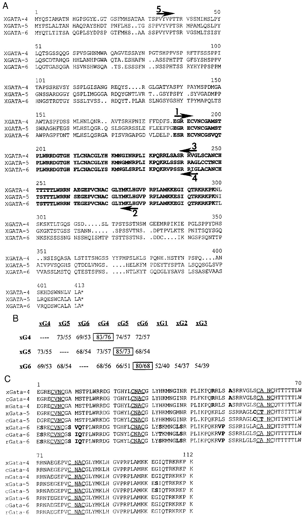 FIG. 1. The GATA-4, GATA-5, and GATA-6 sequences have been conserved during vertebrate evolution as distinct genes. (A) The predicted amino acid sequence of xGATA-4 and xGATA-6 is shown aligned with that of the previously reported (Kelley et al., 1993) xGATA-5a gene. Arrows indicate the sequences used to design PCR primers used for isolating finger region sequences (1 and 2) or for isolating probes specific for xGATA-4 (3 and 5) or xGATA-6 (4 and 5). The highly conserved GATA factor DNA-binding domain containing two similar but distinct zinc fingers is in bold. (B) The amino acid sequences of various GATA factors were compared using the GAP program (GCG, Inc.). The data is given as (% similarity allowing conservative changes)/(% identity). For each set of alignments, the most similar pair is boxed and confirms that genes are conserved across species. The genes are abbreviated, for example: xG4 Xenopus GATA-4, cG5 chicken GATA-5. (C) The highly conserved DNA-binding domain for all reported GATA-4/5/6 genes is shown. The chicken sequences are from Laverriere et al. (1994), mGATA-4 is from Arceci et al. (1993), xGATA-5 is from Kelley et al. (1993), and rGATA-6 is from Tamura et al. (1993). Amino acids that are diagnostic for each individual gene across species are in bold. |