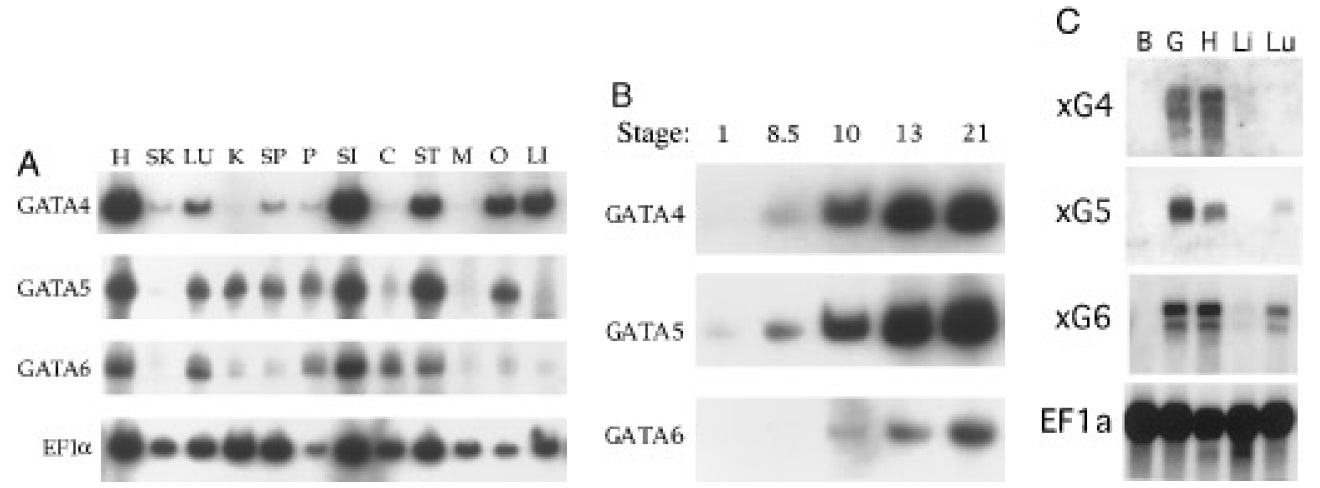 gut (G), heart (H), liver (Li), or lung (Lu). Blots were analyzed using gene-specific probes derived from the xGATA-4/5/6 genes, or the EF-