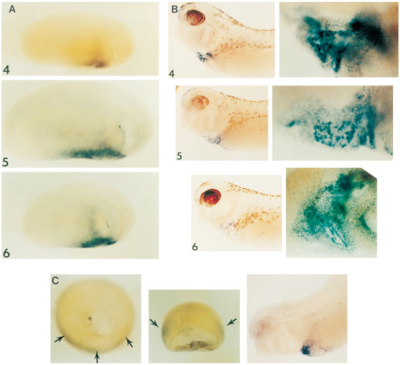 (C) Early staining pattern detecting xGATA-4 transcripts. At stage 10 (left) RNA is detected along one half of the marginal zone. At stage 12