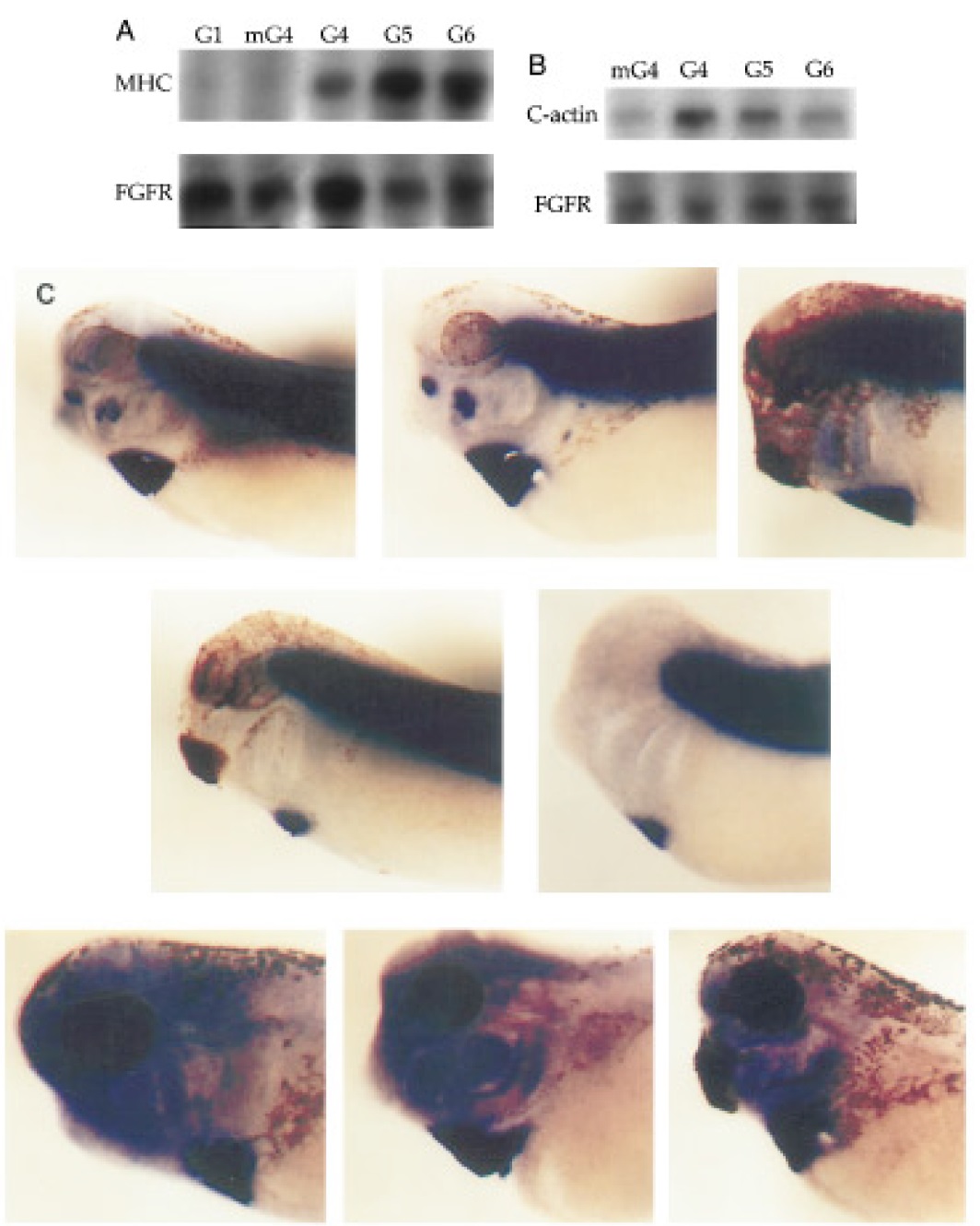and staged embryos, using probes specific for cardiac actin (top) or MHCa (bottom). Note that, compared to (A), a relatively ‘‘thin’’ band of