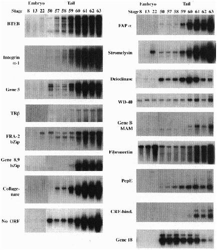 Genes that are up- and down-regulated by thyroid hormone in the tail resorption program of Xenopus laevis have been isolated by a gene expression screen, sequenced, and identified in the GenBank data base. The entire program is estimated to consist of fewer than 35 up-regulated and fewer than 10 down-regulated genes; 17 and 4 of them, respectively, have been isolated and characterized. Up-regulated genes whose function can be predicted on the basis of their sequence include four transcription factors (including one of the thyroid hormone receptors), an extracellular matrix component (fibronectin) and membrane receptor (integrin), four proteinases, a deiodinase that degrades thyroid hormone, and a protein that binds the hypothalamic corticotropin-releasing factor, which has been implicated in controlling thyroid hormone synthesis in Xenopus tadpoles. All four down-regulated genes encode extracellular proteins that are expressed in tadpoleepidermis. This survey of the program provides insights into the biology of metamorphosis.