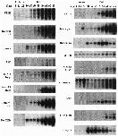 Fig. 1. Developmental RNA blots for 16 of the 17 up-regulated genes and one of the 4 down-regulated genes (gene 18). The first three lanes are blots of total embryo; the remaining lanes were from tail extracts (7). Stage numbers were assigned according to Nieuwkoop and Faber (8). ORF, open reading frame.