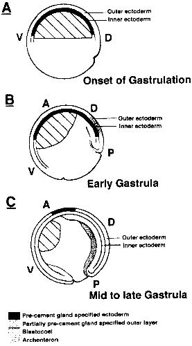 Fig. 3. Timing of Xenopus cement gland specification. Using specification assays, where ectoderm is explanted from the embryo at various stages and allowed to differentiate in culture, the following conclusions can be reached regarding timing of cement gland induction. See Timing of Cement Gland Induction in the text for discussion. A: At the onset of gastrulation the inner layer of the ectoderm is specified as pre-cement gland, both dorsally and ventrally. V: ventral. D: dorsal. B: By early gastrula, in addition to continued cement gland specification in the inner layer, the outer dorsal ectoderm is weakly specified as cement gland. A: anterior. P: posterior. C: At mid to late gastrula the cement gland primordium is specified in the outer layer of the anterior dorsal ectoderm, while the inner layer of the dorsal ectoderm has lost this specification and presumably been reprogrammed towards a neural fate