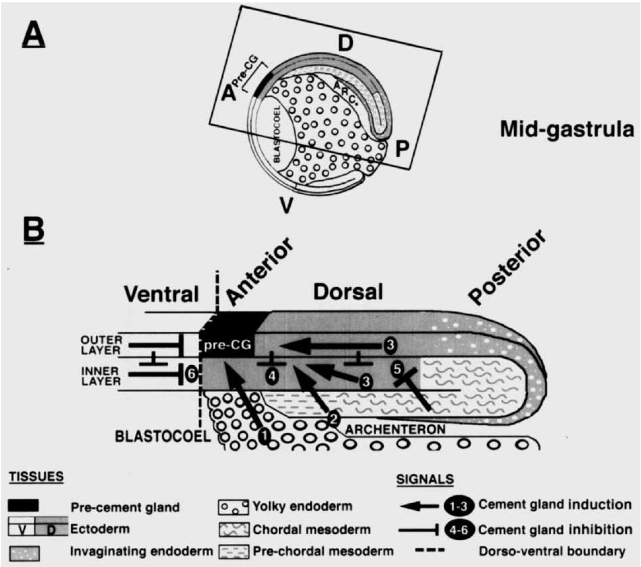The cement gland is a mucus-secreting organ found at the extreme anterior of frog embryos. It attaches the embryo to a solid support before swimming and feeding begin, and also serves a related sensory function that stops the embryo from moving once it is attached. Cement gland is an extremely useful anterior marker, whose study continues to yield fundamental information concerning vertebrate axial patterning. Cement gland arises from the outer layer of the embryonic ectoderm and, in Xenopus, forms a cone of columnar epithelium. It is the first ectodermal organ to differentiate, beginning to do so by late gastrula. A battery of genes expressed in the developing and mature cement gland serve as useful markers. Cement gland development can be influenced by both stimulatory and inhibitory cell interactions. Stimulatory signals arise from the anterior neural plate, head endoderm, and the dorsal mesoderm. Inhibitory signals are present in the posterior dorsal mesoderm and in ventralectoderm and mesoderm. Further, signalling between the ectodermal layers may restrict cement gland differentiation to the outer ectodermal cells. Several secreted molecules are able to induce or repress cement gland formation: these include noggin, follistatin, hedgehog, chordin, retinoic acid, embryonic fibroblast growth factor (eFGF), Bone Morphogenetic Protein-4 (BMP-4), and Xwnt-8. Several of these factors alter expression of the homeodomain gene Xotx2, which may be a transcriptional activator of cement gland differentiation genes. The significance of the cell interactions and factors described in positioning cement gland at the front of the embryo is explored.