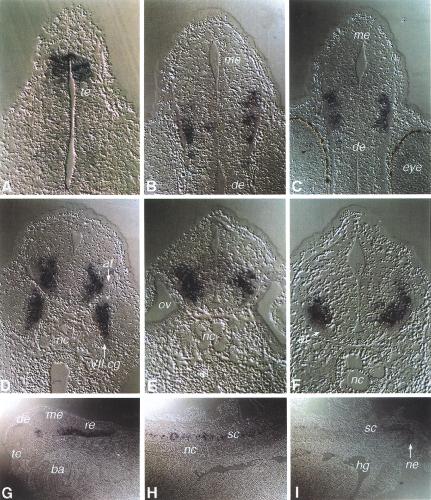Fig. 7. Expression of Xsal-1 in the brain and spinal cord. Sections of stained glycol methacrylate embedded embryos at stage 32 are shown. (A-F) Transversal sections at different levels of the CNS: (A) at the level of the telencephalon (te) (B) level of the anteriormesencephalon (me), (C) level of the posteriormesencephalon, diencephalon (de). The pigment of the eye (eye) is seen in brown. (D) Section through the rhombencephalonanterior of the otic vesicle. Outside the brain staining is detected in the ganglion of the VIIth cranial nerve (Vll.cg). The arrow indicates the lateralaxon tract (at), (nc) notochord. (E) Section through the rhombencephalon at the level of the otic vesicle (ov). (F) Section through the anterior spinal cord. Staining is confined to the region of motor neurons and interneurons. (G-I) Sagittal sections of the head region (G), the trunk region (H) and the tail region (I) of a stained embryo at stage 32. (ba) branchial arches, (hg) lumen of the hindgut, (ne) neuro-enteric canal, (re) rhombencephalon, (sc) spinal cord.