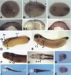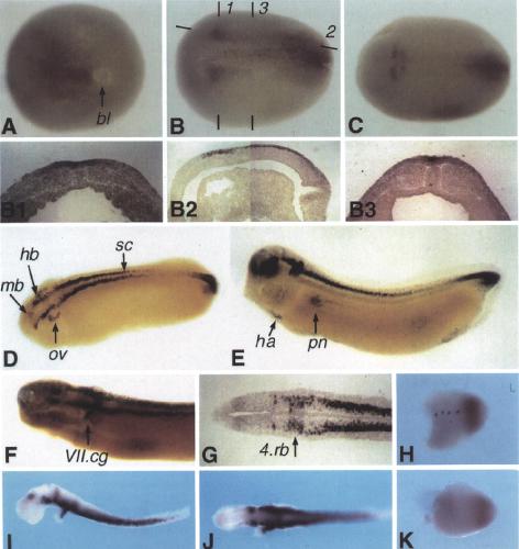 Fig. 5. Expression pattern of Xsal-I during development using whole-mount in situ hybridization and sections of stained embryos. (A) Dorsal/posterior view of an embryo at stage 121/2. Staining is detected in the posterior neural plate and the region of the prospective neural folds. The arrow indicates the closing blastopore. (B) Dorsal view of an embryo at stage 15. Staining is confined to two parallel stripes within the neural groove and two broader stripes that run along the neural folds. At the anterior border of the latter stripes staining extends more laterally. No staining is observed anterior of the prospective midbrain. The short lines numbered 1-3 indicate the plains of vibratome sections shown in B1-B3. (B1) Transversal section of the embryo shown in (B). At the level of the lateral stripes staining is detected in the epithelial as well as in the sensorial layer of the neuroectoderm. (B2) Parasagittal section of an embryo at stage 15. In the anterior part of the Xsal-1 expression domain the epithelial as well as the sensorial layer of the neuroectoderm are stained. Note the sharp anterior border of the expression. (B3). Transverse section of the embryo shown in (B) at the level of the future spinal cord. Staining is confined to the epithelial layer of the neuroectoderm. (C) Dorsal view of an embryo at stage 18. Staining is prominent in two discrete lateral pairs of stripes at the anterior border of expression in the midbrain/hindbrain region. Staining of the neural plate dorsally of the blastopore is more diffuse. (D) Dorso/laterai view of an embryo at stage 27. A cleared embryo is shown. Staining is confined to two parallel stripes in the midbrain (mb), hindbrain (hb), and the spinal cord (sc) Outside the CNS transient staining is observed in the ventral part of the otic vesicle (ov). (E)Lateral view of an embryo at stage 31. A cleared embryo is shown. Prominent staining is seen in the midbrain, hindbraln, spinal cord, the ganglion of the VIIth cranial nerve, and the tail tip. Staining in the tail tip is more diffuse. Weaker staining is detected in the frontal part of the forebraln and in the heart anlage (ha), the pronephros (pn) and the pronephric duct. (F) Dorso/lateral view of an embryo at stage 31. The arrow indicates the position of the VIIth cranial ganglion (VII.cg) that is stained by Xsal-1. Note the transverse stripe within the hindbrain at the level of the otic vesicle and the lack of staining at the midbrain/hindbraln boundary. (G) Horizontal vibratome section of a stained embryo at stage 31. Staining in the midbrain and spinal cord is defined to the lateral parts. The arrow points to the position of the fourth rhombomere (4.rb). The plain of section was chosen to show the extent of the transverse stripe within the hindbrain. The weak expression further rostrai corresponds to the expression within the forebrain as seen in (E,I). (I,H) Isolated brain and spinal cord of an embryo at stage 32. (1) Lateral view, anterior is left, (J) ventral view, the VIIth cranial ganglion of the left side has been removed. (H,K) Isolated hind limb buds of an embryo at stage 52, anterior is left. (H) left and (K) right bud. Xsal-I staining is found