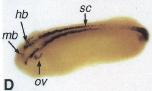 Fig. 6. Spatial relationship of Xsal-1 expression to the expression of En-2 and Krox-20 using whole-mount in situ double staining. (A) Anterior view of an embryo at stage 19 double stained with Xsal-1 (dark blue) and En-2 (red, arrow). En-2 demarcates the future midbrain/hindbrain boundary. (B) Anterior/dorsal view of an embryo at stage 17 double stained with Xsal-1 (darkblue) and Krox-20 (red) Xsal-1 and Krox-20 show an alternating pattern of expression with some overlap of the posterior parts of the Xsal-1 stripes with the anterior parts of the respective Krox-20 stripes. The Krox-20 domains are marked by arrow heads. (C) Lateral view of an embryo at stage 28 double stained with Xsal-1 (darkblue) and En-2 (red, arrow). Note that the Xsal-1 expression is interrupted at the midbrain/hindbrain boundary marked by the En-2 stripe. (D) Lateral view of an embryo at stage 31 double stained with Xsal-1 (darkblue) and Krox-20 (red). The arrowheads point to the Krox-20 expression in rhombomeres three and five.