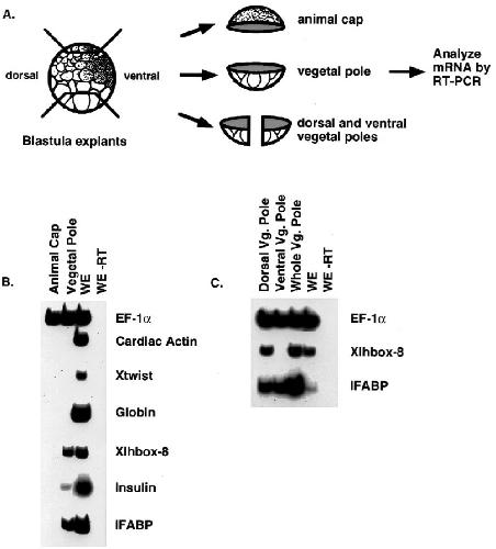 Fig. 1. Autonomous expression of endodermal markers. (A) Animal caps or vegetal poles were dissected from blastula embryos (stage 8-9) as shown. Vegetal pole explants were also dissected into dorsal and ventral halves. Explants were cultured in isolation until midtailbud stages (stages 33-36). RNA levels were assayed by RT-PCR. (B) Vegetal pole explants express Xlhbox-8, IFABP and insulin, but not the mesodermal markers cardiac actin, Xtwist or globin. Animal caps do not autonomously express either mesodermal or endodermal markers. (C) The capacity for Xlhbox-8 expression is localized to the dorsal side of the vegetal pole whereas IFABP expression is seen in both the dorsal and ventral vegetal pole explants. WE lanes represent RT-PCR products where mRNA from an unmanipulated embryo was used for cDNA synthesis. The WE-RT lanes represent assays in which reverse transcriptase was left out of the cDNA synthesis step with whole embryo RNA as a template. This serves as a control for DNA contamination. Elongation factor 1 alpha (EF-1a) is included as a control to insure that similar amounts of RNA are used in each lane.