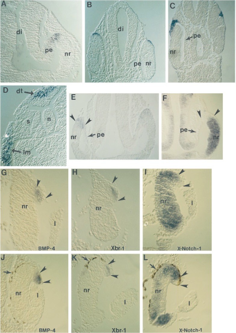 FIG. 3. Sections showing expression of Xbr-1, BMP-4, and X-Notch-1 during eye development, after whole-mount in situ hybridization. (A, B, C, D, E, H, K) Expression of Xbr-1 (I, L), expression of X-Notch-1 (G, J), and expression of BMP-4. (A, B, C) Transverse sections at the levels of the eyes at stage 25 (A), stage 26 (B), and stage 278 (C). Expression is found in the area between the prospective neural retina and the pigment epithelium (A) and ends up in the margin of the eye (C). Note that the pigment epithelium thins out during development (from A to C) and eventually envelops the back of the neural retina (arrows in J, K, L). (D) Posterior transverse section of a stage 25 embryo showing expression of Xbr-1 in the dorsal neural tube (dt) and the lateral mesoderm (lm). (E, F) Comparison of Xbr-1 and X-Notch-1 expression in the eyes at stage 25/26. The area between arrowheads expresses Xbr-1 (E) but not X-Notch-1 (G). Note that at this stage X-Notch-1 is expressed uniformly in the prospective neural retina. (G, H, I, J, K, L) High magnification of sections through the eyes, showing a comparison between expression of BMP-4 (G, J), Xbr-1 (H, K), and X-Notch-1 (I, L) at stage 31/32 (G, H, I) and stage 33/34 (J, K, L). The area of the eye that expresses Xbr-1 (H, K) and BMP-4 (G, J) is the part of the prospective dorsal ciliary margin and is included between arrowheads. These sections show that expression of BMP-4 and Xbr-1 in the eye is largely coincident at both stages. The same area of the eye appears negative for X-Notch-1 expression (area between arrowheads in I, L). Note that as the neural retina differentiates, between stages 312 (I) and 33/34 (L), X-Notch-1 expression becomes gradually restricted to the periphery of the eye, but is never observed at the very edge of the eye (arrowheads). In (G, H, I) the prospective pigment epithelium has thinned out and cannot be easily distinguished. In (J, K, L) arrows point to the pigment epithelium which is now easily recognizable by the brown pigment. In some sections the lens (l) has been detached. Abbreviations: di, diencephalon; dt, dorsal neural tube; l, lens; lm, lateral mesoderm; n, notochord; nr, prospective neural retina; pe, prospective pigment epithelium; s, somite. |