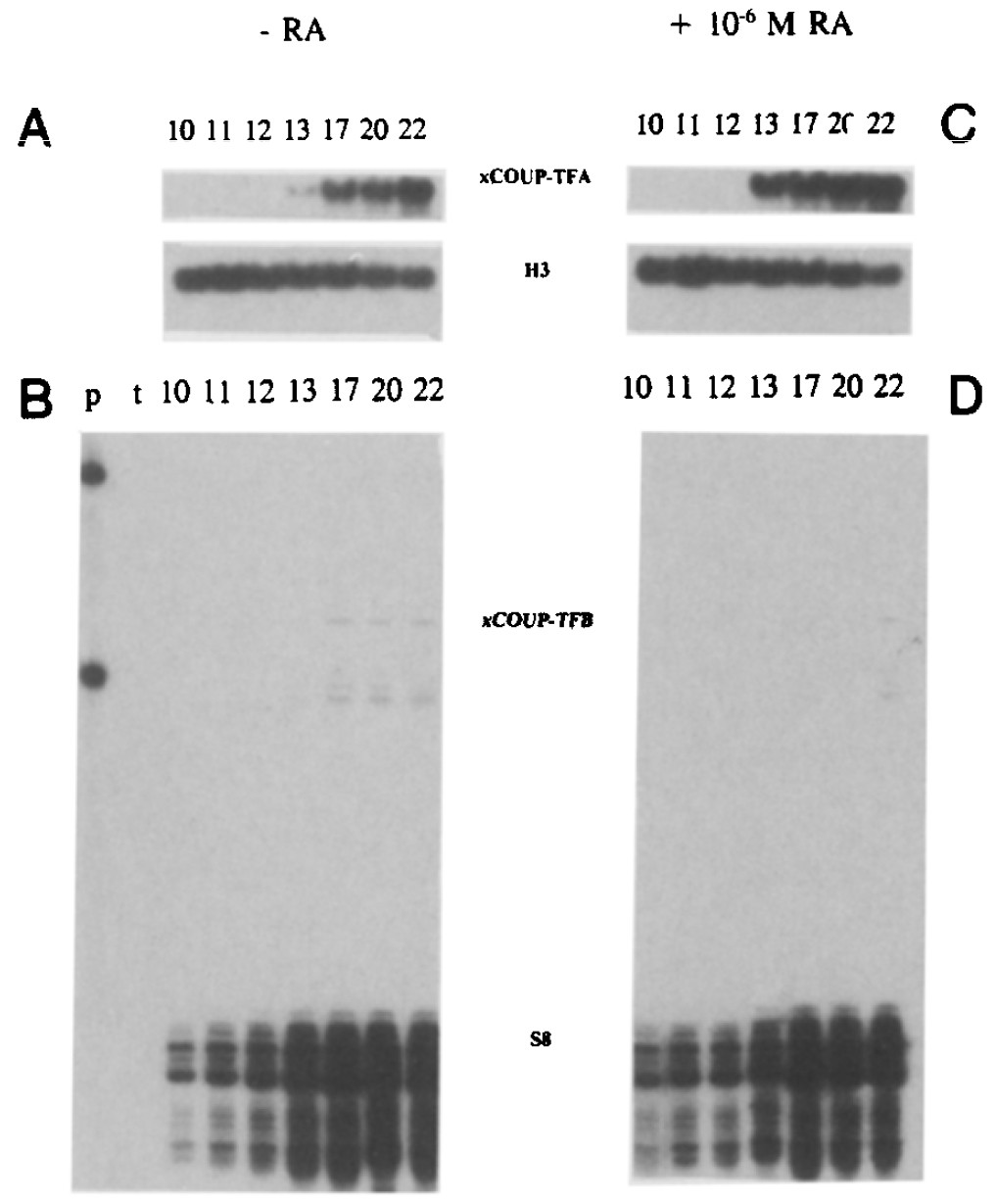 10-6M RA from stage 10 onwards. Embryos in A-D were hybridized with an xCOUP-TF-A probe; E-H show xCOUP-tf-B expression in normal and