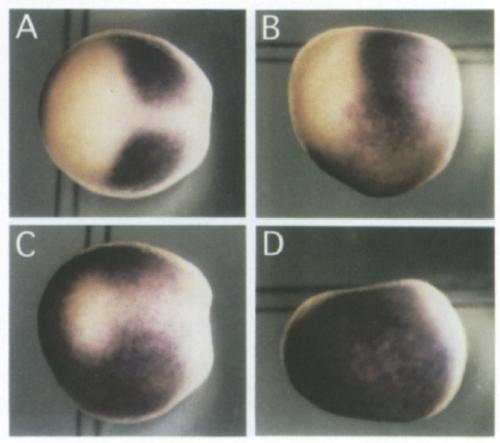Fig. 7. Treatment with retinoic acid causes an expansion and enhancement of ectodermal Xgbx-2 expression in whole embryos. Pigmented embryos were treated for 30 min at stage 9 with 1OpM all-rrans RA, fixed when controls reached stage 12.5-13, and processed for whole mount in situ hybridization with Xgbx-2 antisense probe. Embryos that were only treated with ethanol, the RA solvent, looked the same as untreated control embryos (not shown). For all embryos, anterior is to the left, and the magnification is the same. (A) Untreated control embryo, dorsal view. (B) The same control embryo, lateral view. (C) RA-treated embryo, dorsal view. (D) RA-treated embryo, lateral view.