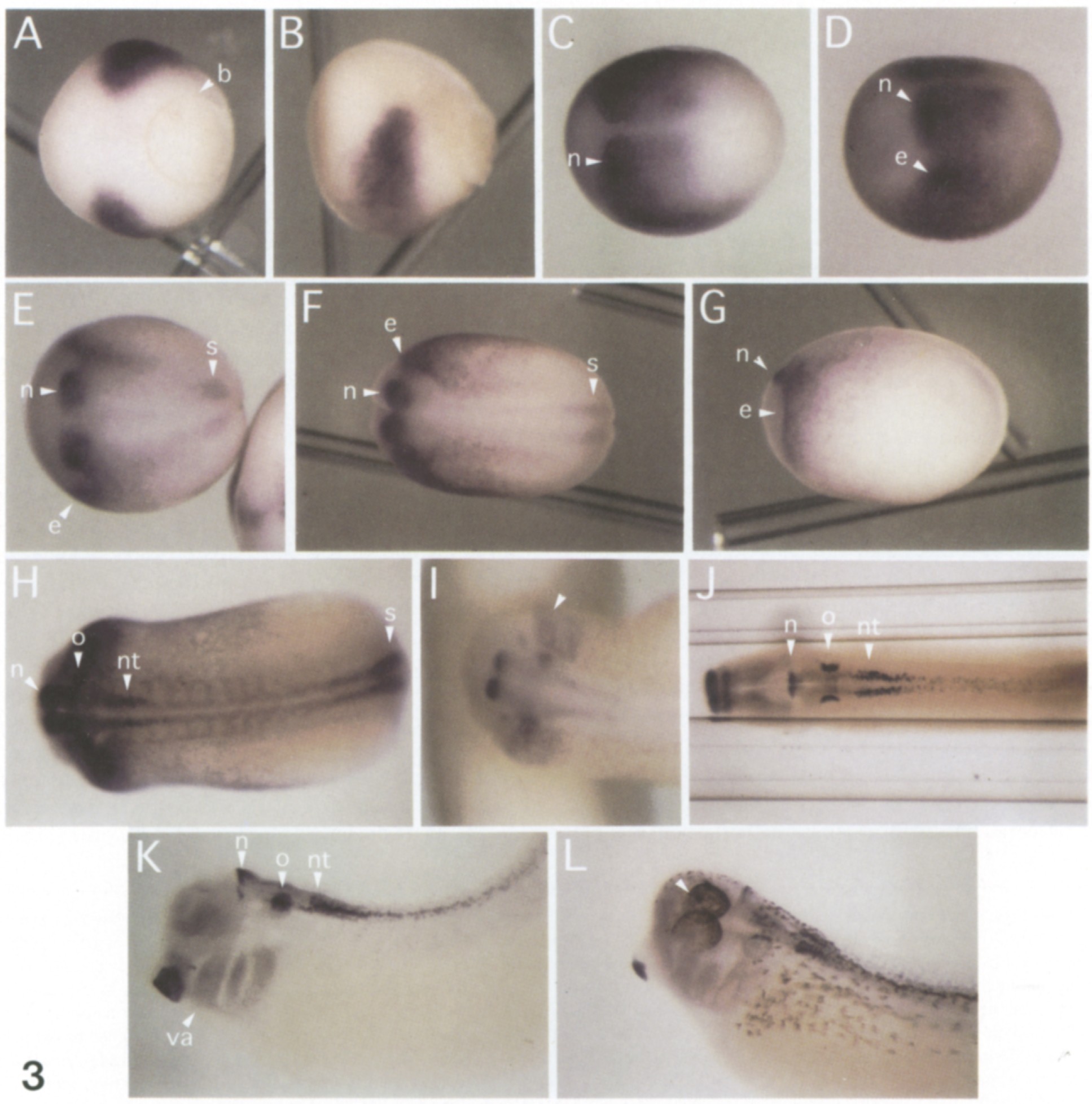 Fig. 3. Spatial expression of Xgbx-2 during early development. The expression was analyzed by whole mount in situ hybridization of albino embryos. In all pictures, anterior is to the left. (A) Dorsal view of a stage 11 embryo. Note the wide gap at the dorsal midline and the distance of the expression from the blastopore lip (b). (B) Dorsolateral view of a stage 11 embryo. (C) Dorsal view of a stage 13-14 embryo. The gap in expression at the dorsal midline has narrowed. Note the sharp anterior expression border in the neuroectoderm (n). (D) Lateral view of a stage 13-14 embryo. Xgbx-2 is expressed in the neuroectoderm (n) and in epidermal ectoderm (e). (E) Dorsal view of a stage 15 embryo. The neurectodermal expression is concentrated in a pair of anterior stripes (n). The epidermal expression has a sharp anterior border (e). There is additional expression in the presumptive posterior spinal cord (s). (F) Dorsal view of a stage 19-20 embryo. Labeling as in (E). (G) Lateral view of a stage 19-20 embryo. The lateral epidermal expression (e) shows a sharp anterior border and gradually tapers off towards the posterior end. Labeling as in (E). (H) Dorsal view of a cleared stage 22-23 embryo. Xgbx-2 is expressed in the anteriorneuroectoderm (n), in the otic vesicle (o), in a pair of lateral stripes anterior to the otic vesicle, in the neural tube (nt) posterior to the otic vesicle, in the posterior spinal cord (s), and in the future branchial arches (lateral to the otic vesicle). (I) Dorsal view of an uncleared stage 22-23 embryo. Expression is in the region of the neural crest (arrowhead) ventrally and posterioventrahy to the otic vesicle. (J) Dorsal view of a cleared stage 31 embryo. Note the crescent-shaped expression in the dorso-medial part of the otic vesicle (0). Labeling as in (H). (K) Lateral view of a cleared stage 31 embryo. Note expression in the dorsal and ventral part of the anteriorhindbrain (n). Them is weak expression in the region of the visceral arches (va). Labeling as in (H). (L) Dorsolateral view of a cleared stage 31-32 embryo, showing Xgbx-2 expression in the neural tube dorsal to the eye (arrowhead).