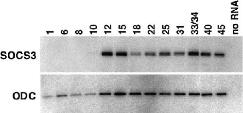 Figure 2. Developmental expression of suppressor of cytokine signaling-3 (SOCS3). Total cellular RNA from staged embryos was used as to produce first-strand cDNA template for the amplification reaction. Ornithine decarboxylase (ODC) was used as control for RNA recovery. Numbers represent the Nieuwkoop and Faber stage of development. “no RNA” is a negative control that lacked template.Download figure to PowerPoint