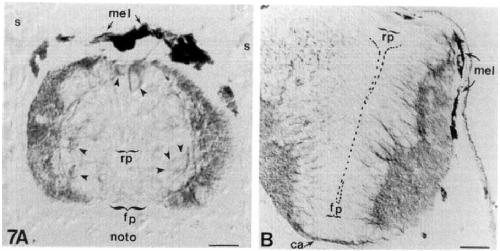cord are melanocytes (mel). B: Transverse section of rostra1 midbrain.