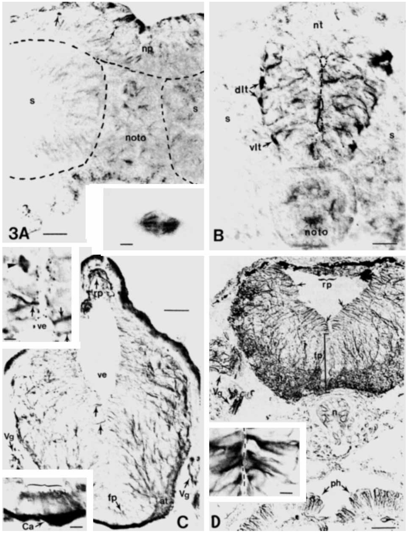 and ventrolateral (vlt) axon tracts and numerous radial glial fibers
